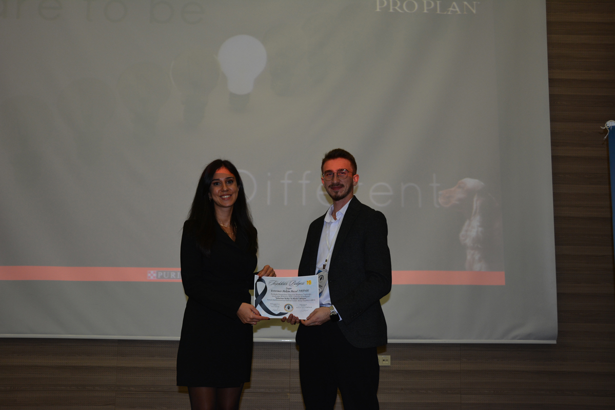 Dördüncü oturumda ise Dr. Mehmet Suat Yılmaz, “Nörolojik Muayeneden Cerrahi Masasına: Kedi ve Köpeklerde Spinal Kord Lezyonlarına Klinik Yaklaşım” başlıklı sunumunu gerçekleştirdi. Yılmaz, küçük hayvanlarda spinal kord lezyonlarının nörolojik muayene basamaklarından cerrahi karar süreçlerine uzanan değerlendirme yöntemlerini ayrıntılı biçimde ele aldı. Vaka örnekleri üzerinden klinik bulguların yorumlanması, tanısal görüntüleme tekniklerinin etkin kullanımı ve tedavi sürecinde izlenen güncel yaklaşımlar hakkında katılımcılara kapsamlı bilgiler sundu.